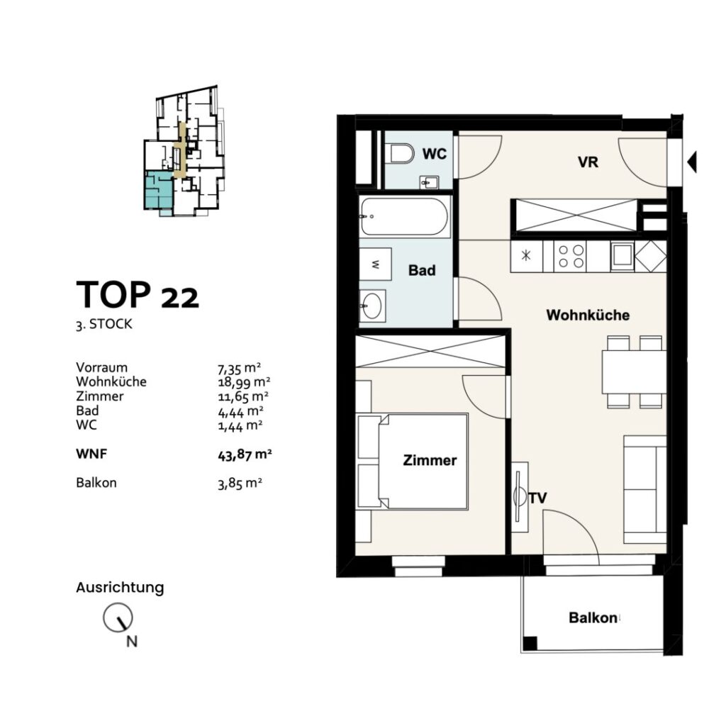 This well-designed 2-room apartment with an outdoor area is for sale. The highlight of the apartment is the spacious living kitchen of over 18 m², which offers direct access to a 3.85 m² large balcony. The adjacent bedroom has more than 11 m² and provides enough space for a bed and a wardrobe. The bathroom is equipped with a bathtub and a washing machine connection, while the toilet is separately located.