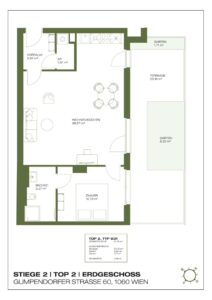 This well-furnished 2-room apartment features an open living area with kitchen, a bedroom, an entrance hall, a storage room with washing machine connection, and a bathroom with shower and toilet. The highlight of the apartment is the 23.19 m² large terrace and the total of 10.23 m² large garden, which adjoin the living area.