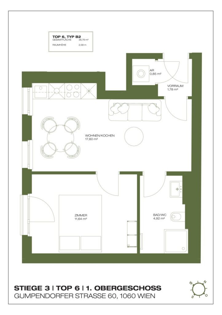 A new building with 56 serviced apartments ranging from 36.79 m² to 79.7 m² is being constructed at Gumpendorfer Straße 60 in Vienna Mariahilf.