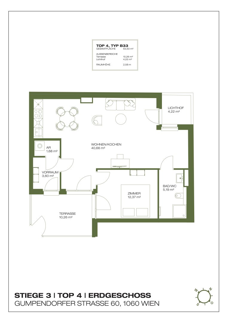 A new building with 56 serviced apartments ranging from 36.79 m² to 79.7 m² is being constructed at Gumpendorfer Straße 60 in Vienna Mariahilf.