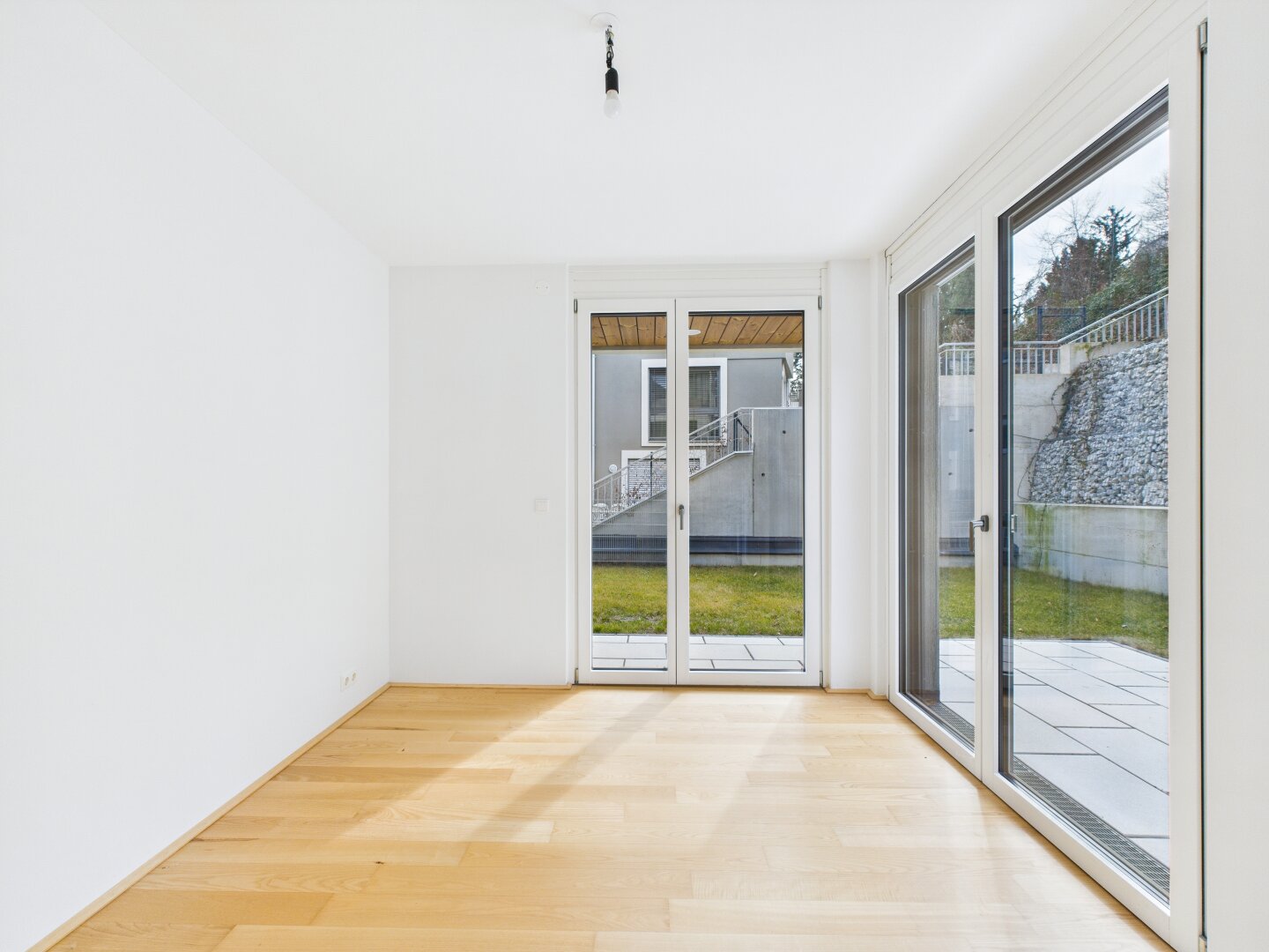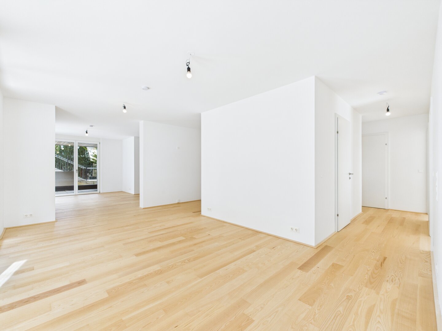 - Real wood parquet floors, large-format tiles in the sanitary rooms