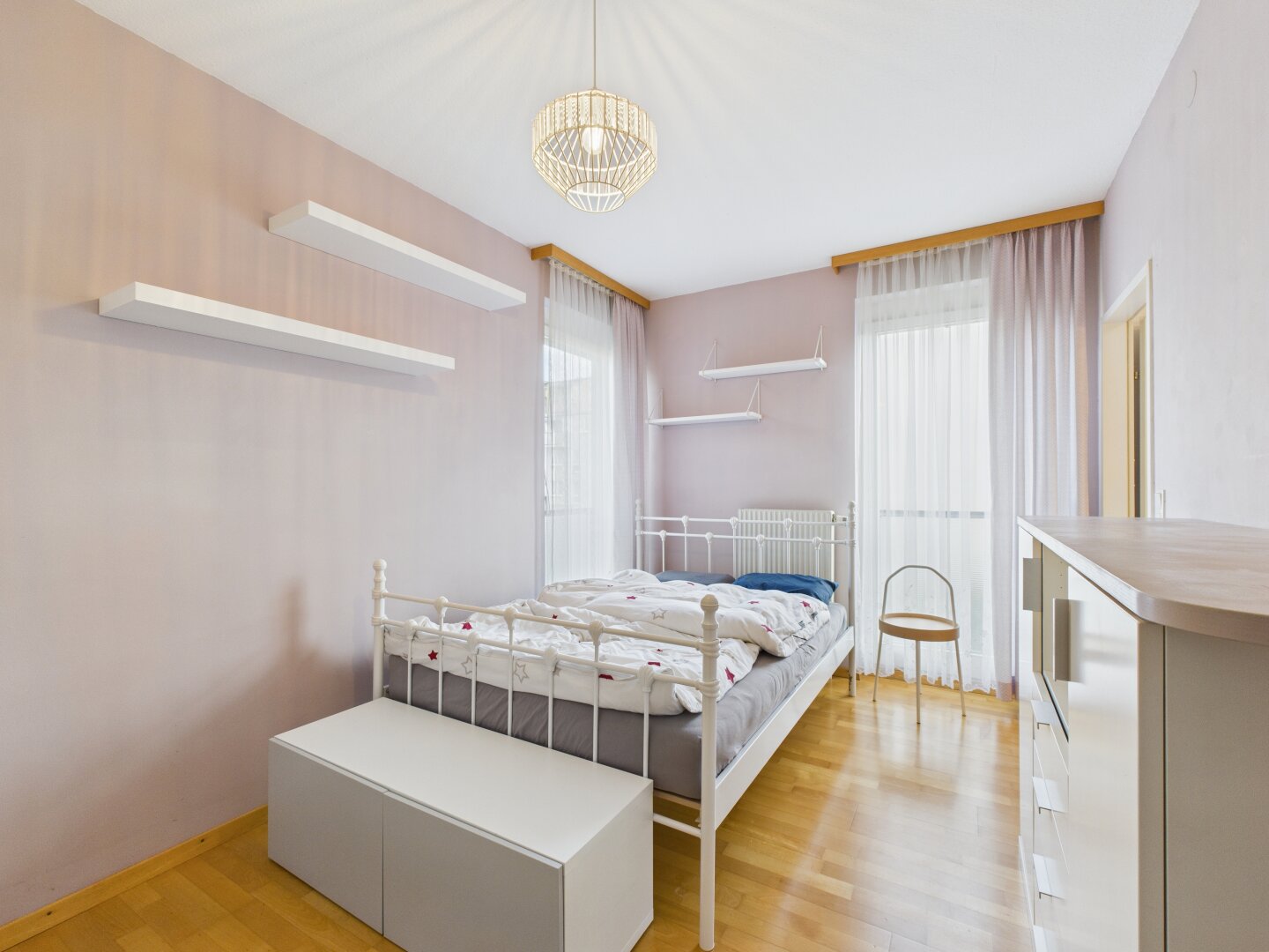 The bathroom with shower and washing machine connection is particularly charming. The walk-in accesses from the kitchen and bedroom create an intelligent circular flow, giving the apartment a wonderful dynamism. A separate guest toilet and a practical storage room complete this well-thought-out concept, making the property a functional and highly inviting home.