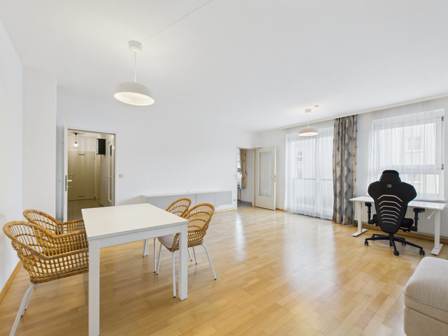 This approximately 74 m² two-room apartment on the first floor demonstrates how harmoniously spaciousness and a clever room concept can be combined. Right upon entering the inviting hallway, your gaze falls on the over 30 m² living room, which serves as the light-filled center of the apartment. The impressive glass front opens up the space visually and creates a seamless transition to the private, over 5 m² loggia – an ideal retreat for morning coffee or relaxed evenings outdoors.