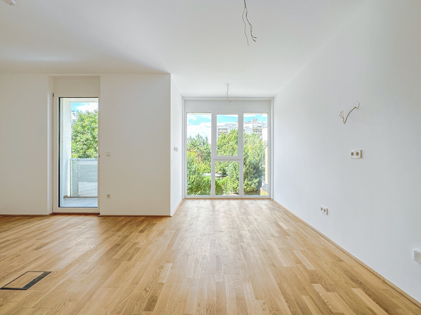 - Hochwertiges Eichenparkett in den Wohnräumen, Fliesen im Format 60/30 in den Nassräumen