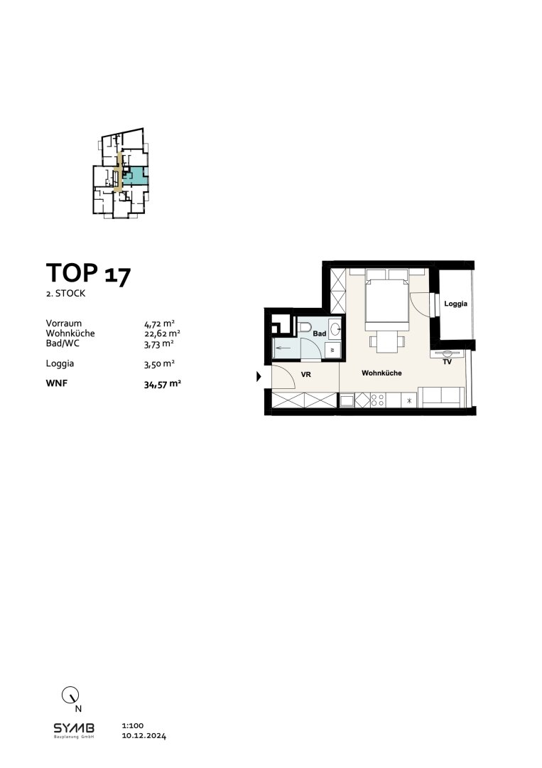 Im 2. Liftgeschoss befindet sich diese smarte 1-Zimmer-Wohnung. Vom Vorraum aus gelangen Sie in das Badezimmer, das mit einer Dusche, einem WC und einem Waschmaschinenanschluss ausgestattet ist. Anschließend betreten Sie die über 22 m² große Wohnküche, die ausreichend Platz für einen Wohnbereich, eine Küche und ein Bett bietet. Alternativ kann die Wohnküche auch mit einer ausziehbaren Couch eingerichtet werden. Die angrenzende 3,50 m² große Loggia bietet die Möglichkeit, eine ganz persönliche Wohlfühloase zu gestalten.