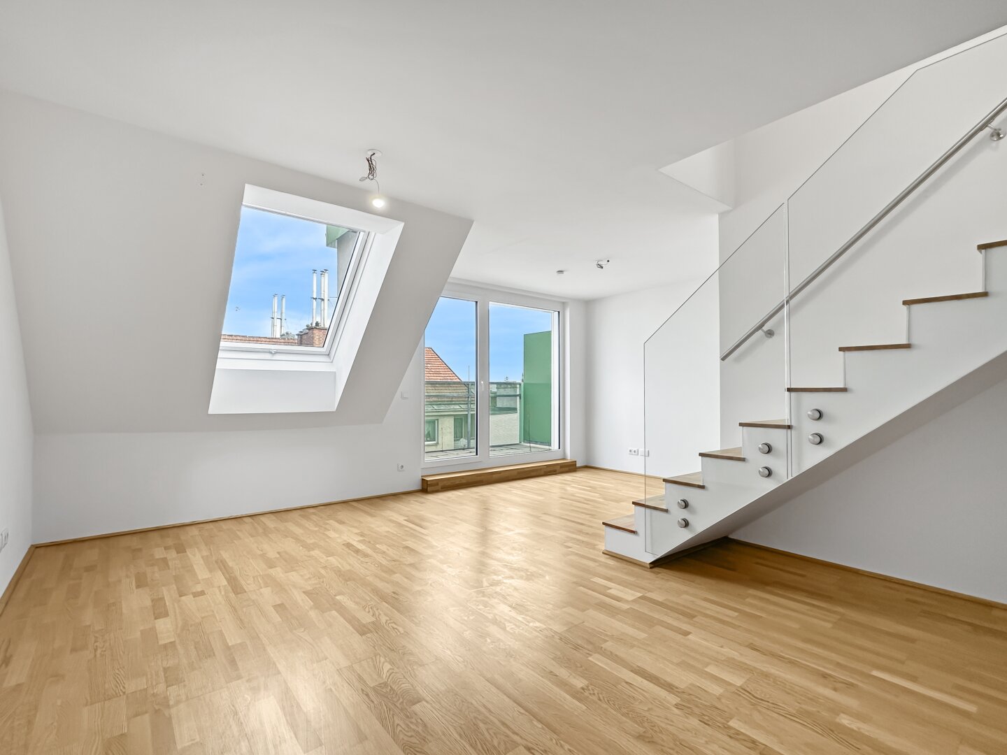 Diese Dachgeschosswohnung verteilt sich auf zwei Ebenen und bietet eine praktische Raumaufteilung mit mehreren Außenflächen, die zusätzlichen Wohnkomfort bieten.