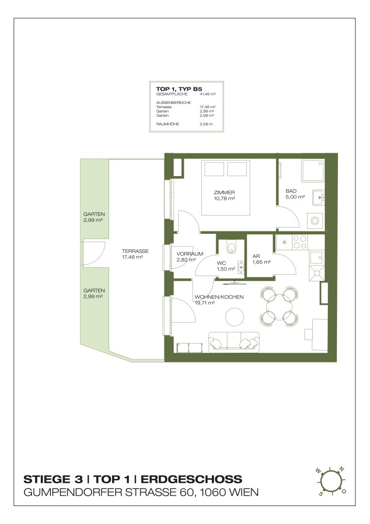 - Terrasse bei Wohnküche und Zimmer mit 17,46 m²