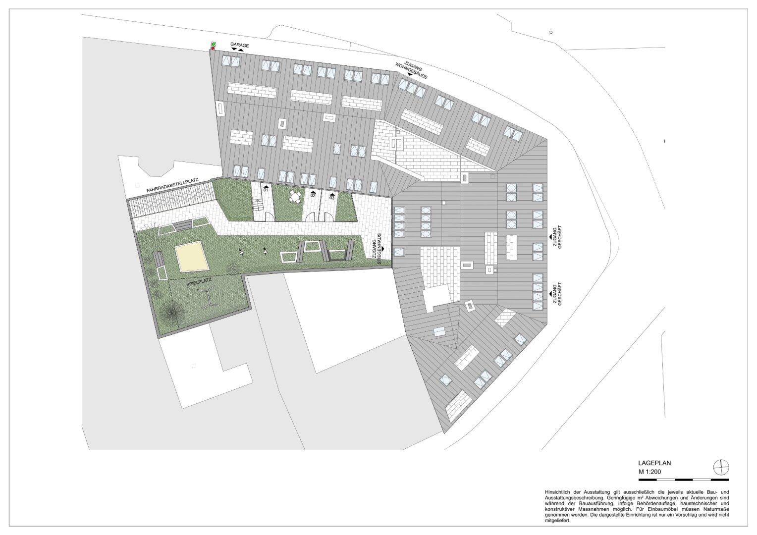 Ein besonderes Highlight ist der private Innenhof, der als ruhige Oase und geselliger Treffpunkt für die Bewohner dient. Hier können Nachbarn die Gemeinschaft genießen und sich vom lebhaften Alltag entspannen. Für Kinder gibt es einen Sandkasten und eine Schaukel, die zum Spielen einladen. Außerdem steht ein überdachter Fahrradabstellplatz zur Verfügung, der Funktionalität und Komfort vereint. Im Erdgeschoss des Gebäudes sind zudem verschiedene Geschäfte geplant, die das urbane Leben bereichern und für zusätzliche Annehmlichkeiten sorgen.