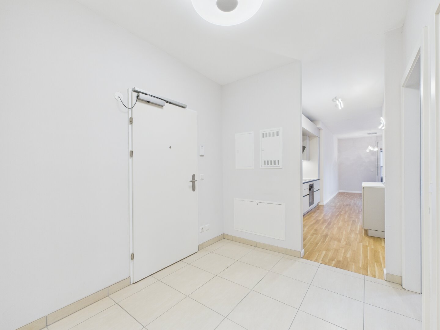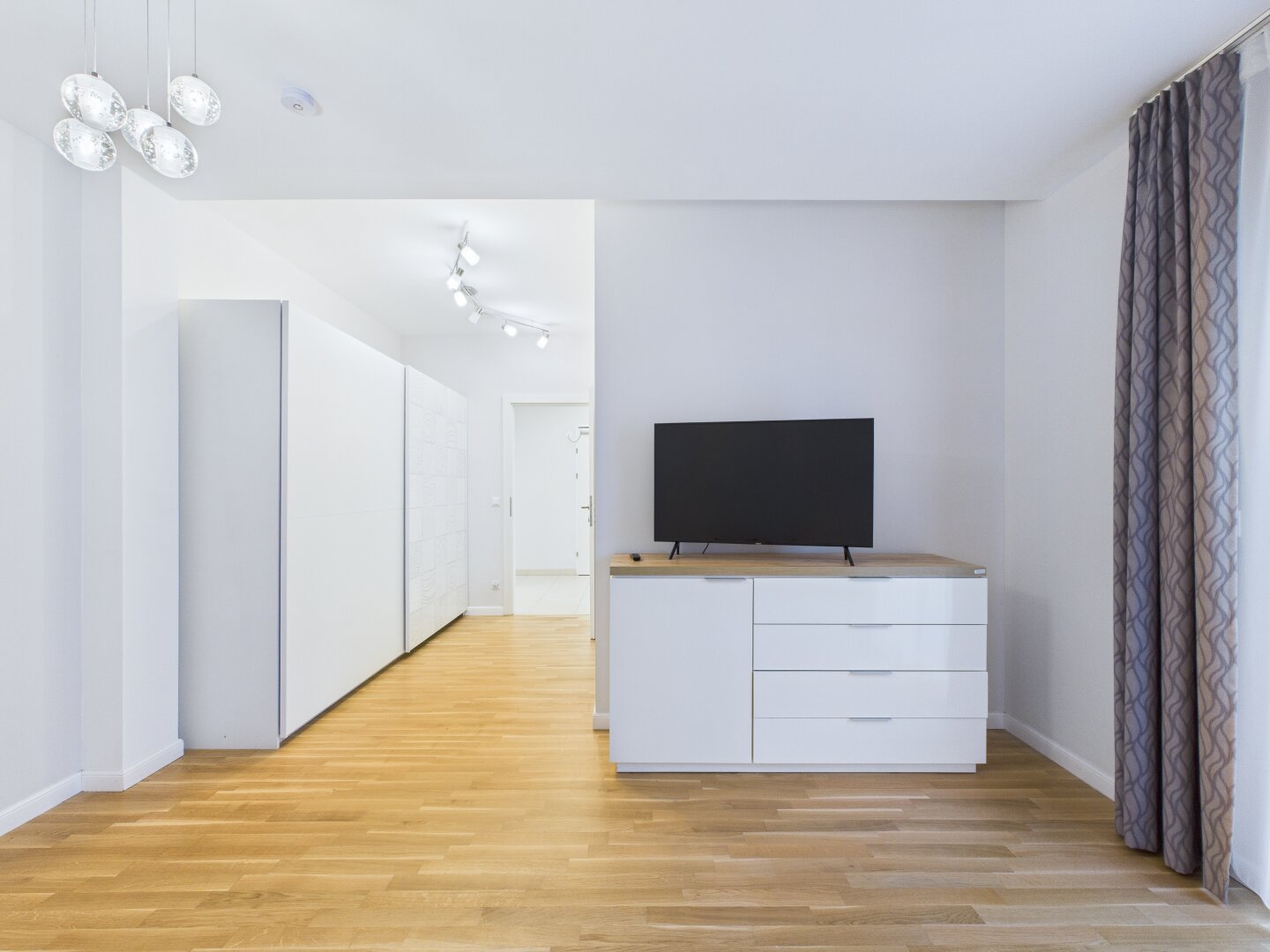 Links vom Wohnbereich führt ein separater Trakt zu den beiden privaten Zimmern. Das größere der beiden ist perfekt als Hauptschlafzimmer geeignet und bietet Raum für einen großzügigen Schrankbereich. Das zweite, gut proportionierte Zimmer ist vielseitig nutzbar – ob als Kinderzimmer, Home-Office oder Gästezimmer. In allen Wohnräumen sorgt der Parkettboden für eine warme, behagliche Wohnatmosphäre.