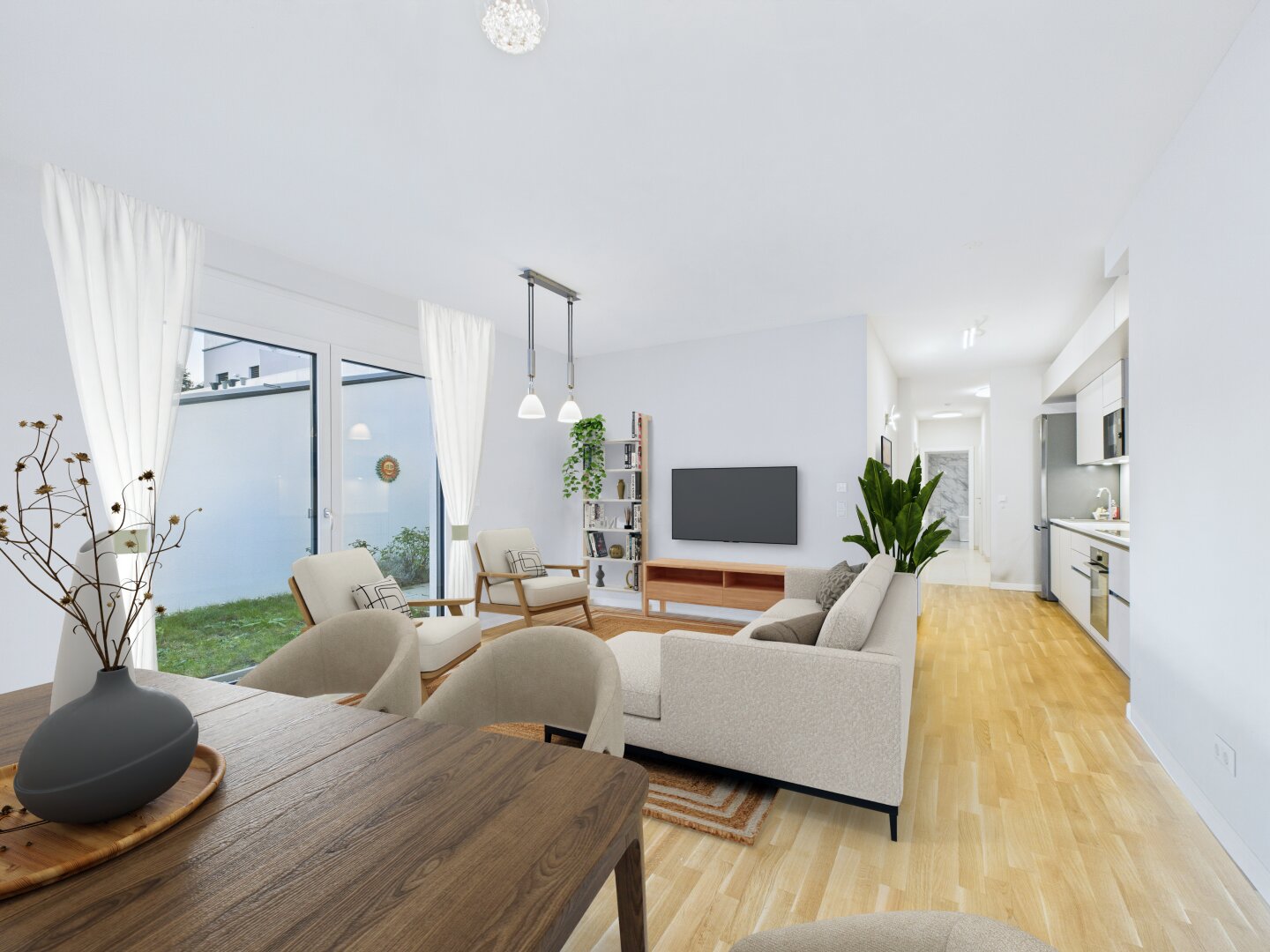 Das Herzstück dieser Wohnung ist die über 32 m² große Wohnküche – ein zentraler, lichtdurchfluteter Lebensraum für Entspannung und Geselligkeit. Große, bodentiefe Fensterfronten sorgen für ein außergewöhnliches Raumgefühl und öffnen den Blick sofort auf die südseitige Terrasse und Ihren ca. 28 m² großen Privatgarten. Innen- und Außenbereich verschmelzen hier nahtlos und erweitern den Wohnraum in die Natur. Dieser weitläufige Bereich bietet reichlich Platz für eine gemütliche Wohnlandschaft und einen großen Esstisch. Ein besonderes Highlight ist die bereits vorhandene, voll ausgestattete Einbauküche mit eleganten weißen Fronten und integrierten Markengeräten. Sie bietet reichlich Stauraum und ist sofort bezugsfertig – eine erhebliche Ersparnis an Zeit, Aufwand und Kosten!